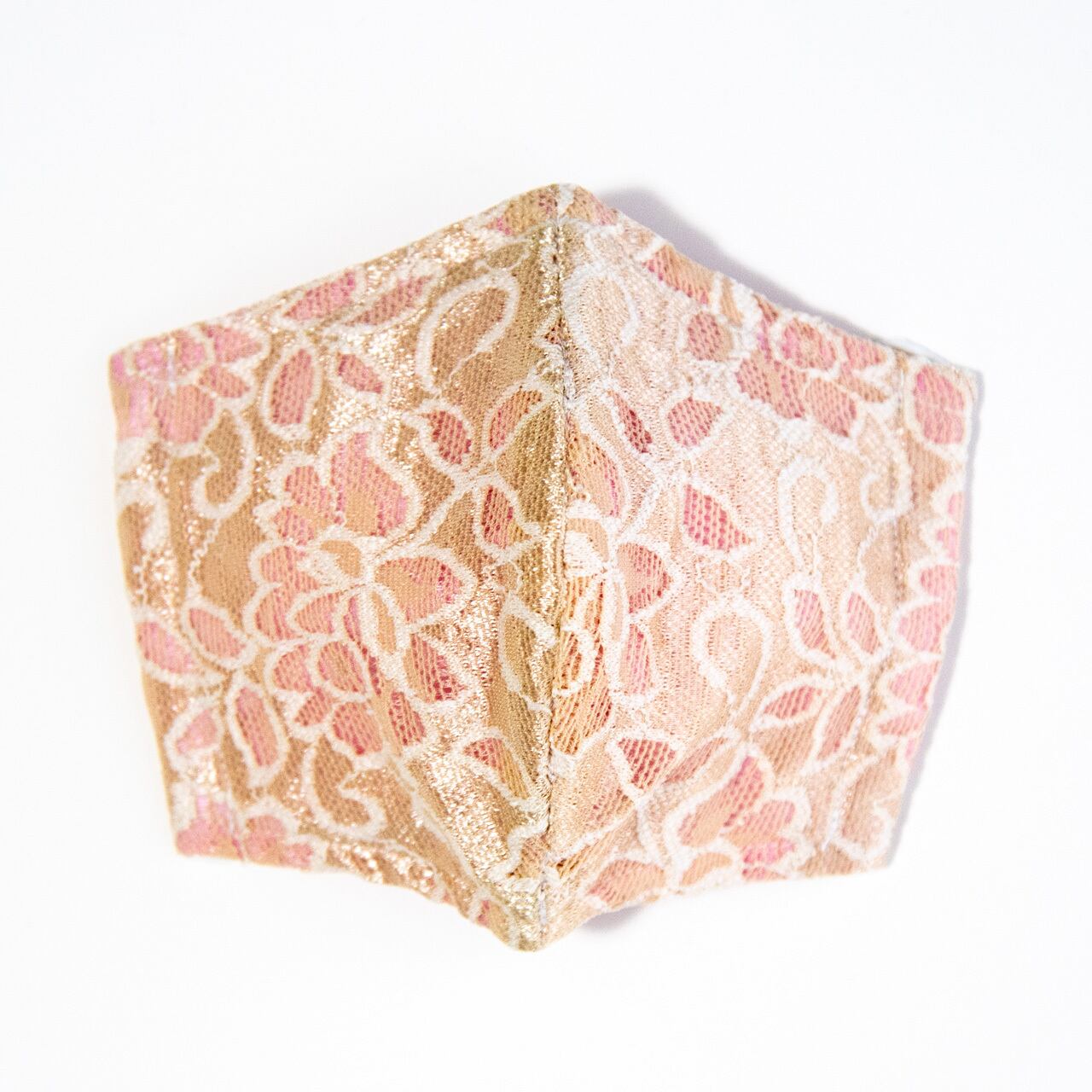 飯能市で生産された「飯能レース」の生地を使って、吉田屋呉服店が仕立てたマスクです。淡いチェリーピンクでフェミニンさにあふれています。